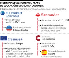 Algunas de las becas más destacadas son las ofrecidas por Colfuturo, ICETEX, el Gobierno de Colombia a través de sus programas de becas internacionales, y las becas de la Unión Europea como Erasmus Mundus. También existen becas específicas para ciertos países o regiones, como las becas Fulbright para Estados Unidos.